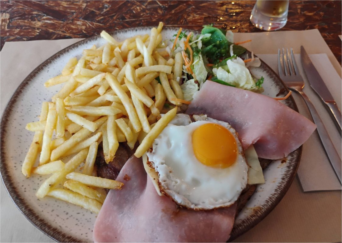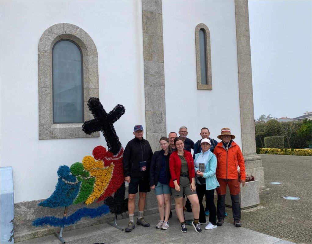 Po drodze mały kościółek z ślicznym znaczkiem roku jubileuszowego zrobionym z suszonych kwiatków, no i my pielgrzymi. Któż by inny jak nie Leszek zaskakuje nas specjalnym transparentem. Na obiad doszliśmy na 15.00. Szczęście, że kucharza nie odsyłają do domu o 14, jak to było w ubiegłym roku. Obiad był w Fao, a to tylko 3 km od mety, czyli noclegu. Spójrzmy na obiadek. Obfity. tzw. Menu peregrinos składa się z zupy, drugiego dania, deseru, kawy i napoju – woda, wino lub piwo. Jak się czyta wspomnienia pielgrzymujących, to niektórzy jedzą byleco. My zgodnie staraliśmy się dobrze odżywiać. Szukanie na siłę umartwienia nie jest dobrym sposobem pielgrzymowania. Po obiedzie trochę padało, ale nie była uciążliwa pogoda.